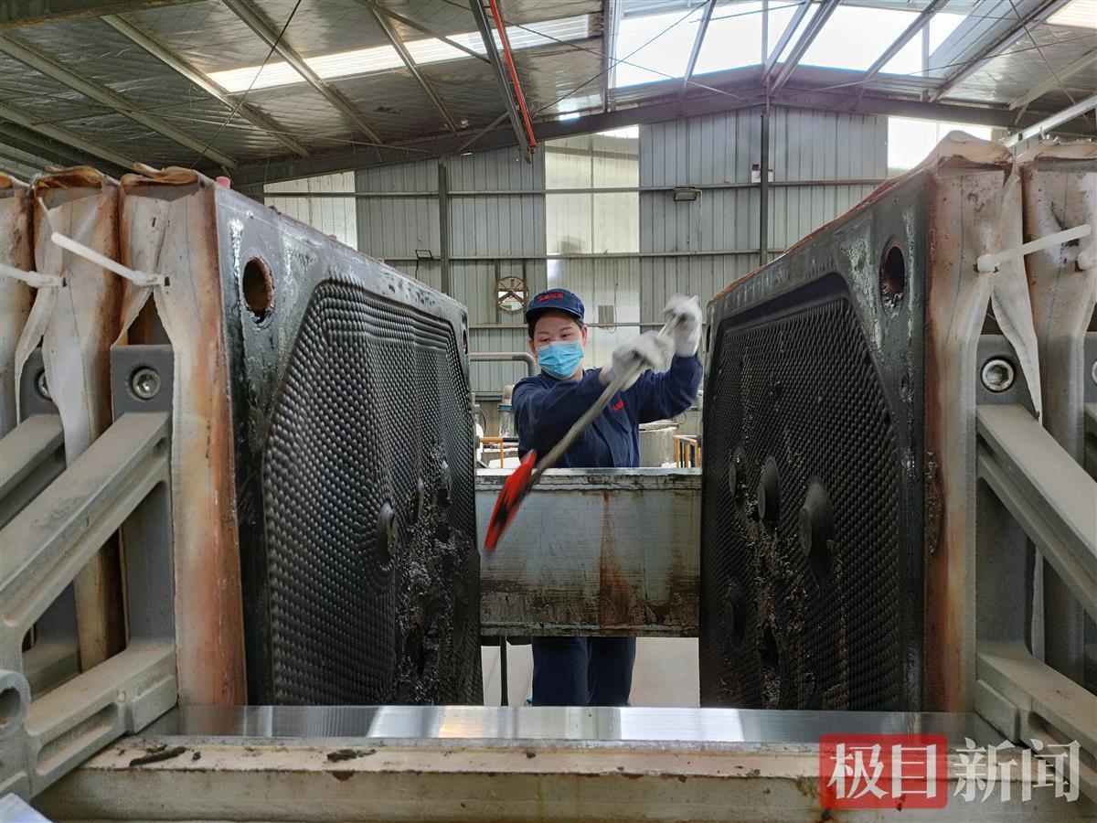 3月28日下午,在位于湖北十堰市茅箭区的湖北玉鑫新型墙材有限公司脱水车间,两名工人手持刮铲正对附着在压滤机上的污泥进行卸料处理。该公司CEO王烨煜介绍说:“污水处理厂送来的污泥,含水量高达80%,我们经压滤机脱水处理,使污泥含水量降至60%,附着力仍很强!”